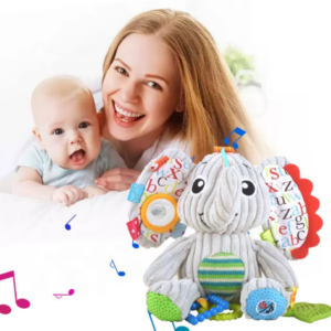 Sonaja colgante de elefante con texturas, colores y sonidos para acompañar a tu bebé en sus primeras aventuras.