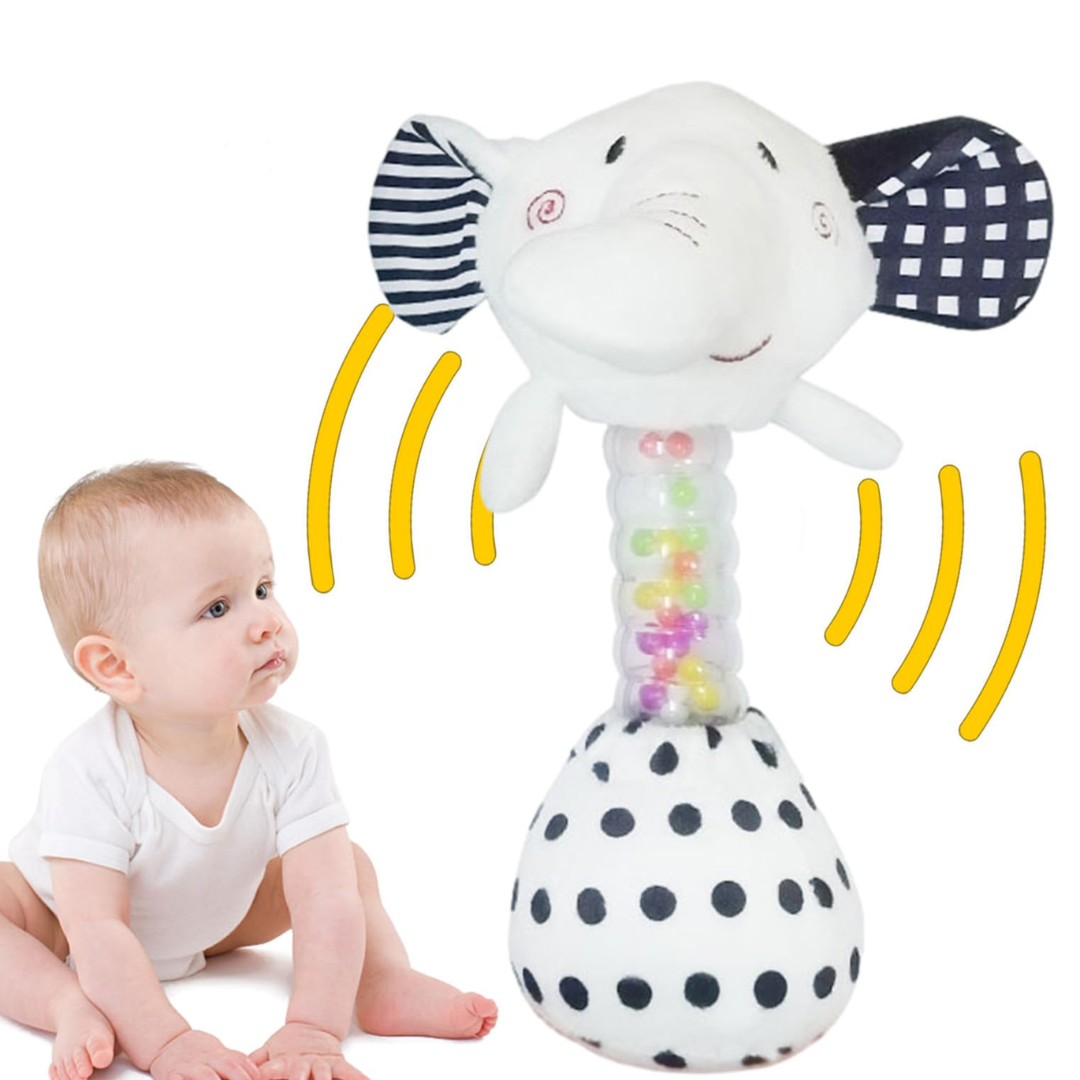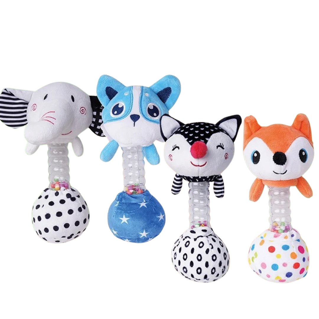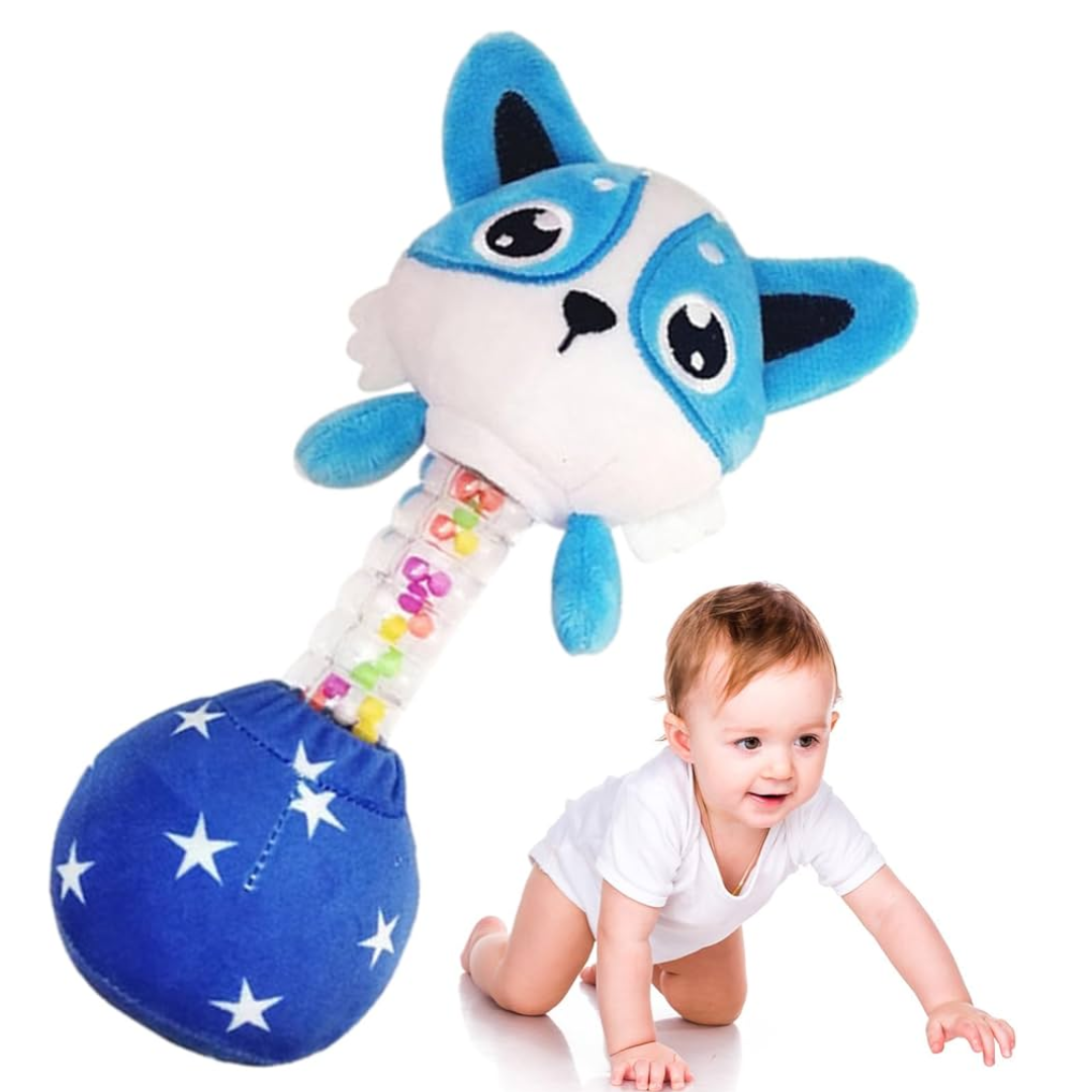 Sonajas de peluche con animalitos adorables, texturas suaves y bolitas sonoras que estimulan la curiosidad y el desarrollo sensorial del bebé.