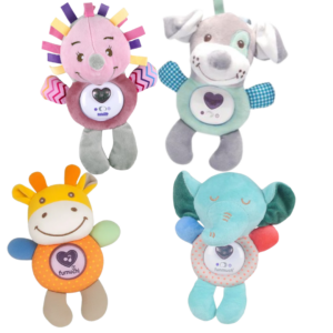 Peluche suave y sensorial, sus sonidos suaves y distintas texturas estimulan los sentidos y la coordinación mano-ojo.